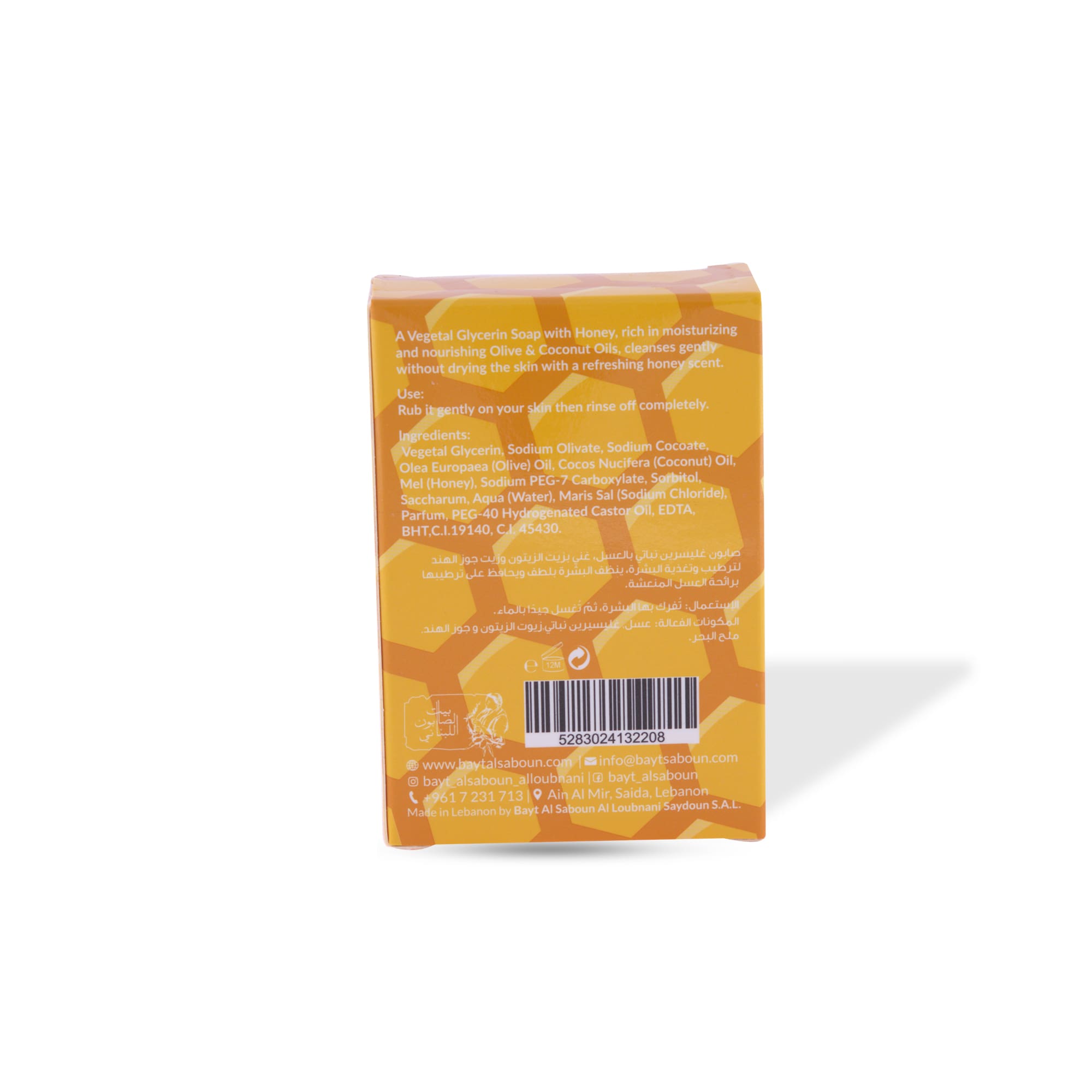 Vegetal Glycerin, Sodium Olivate, Sodium Cocoate, Olea Europaea (Olive) Oil, Cocos Nucifera (Coconut) Oil, Mel (Honey), Sodium PEG-7 Carboxylate, Sorbitol, Saccharum, Aqua (Water), Maris Sal (Sodium Chloride), Parfum, PEG-40 Hydrogenated Castor Oil, EDTA, BHT, C.I.19140, C.I. 45430.